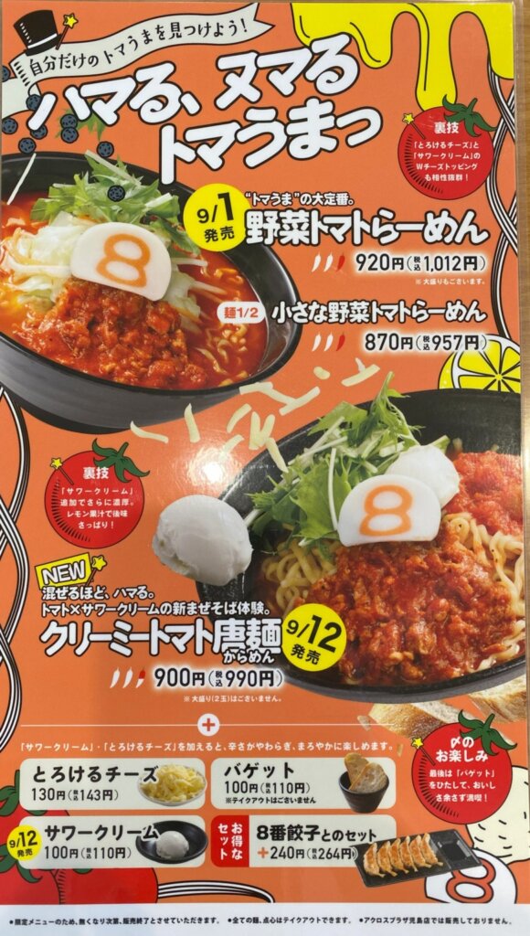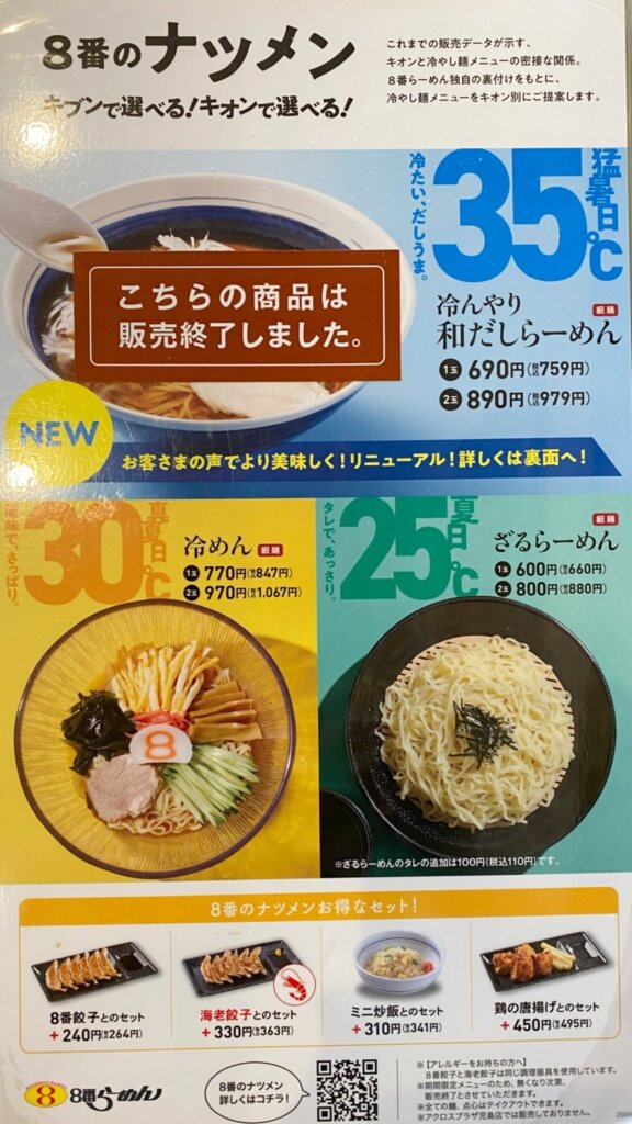 9月もまだまだ猛暑日がありそうですが、「和だしらーめん」は終了していました。昨年は「冷やしらーめん」という名前でしたが、今年は食べずに終わっちゃいましたね。