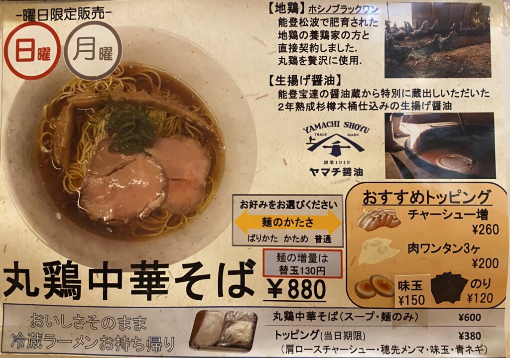 今日は日曜日なので、「丸鶏中華そば」も提供中でした。