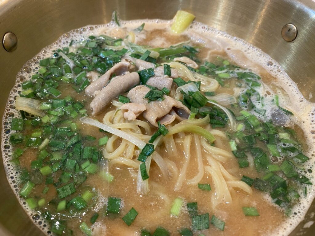 残りの3分の1は、薬味を使いましょうかね。薬味としては、ネギとおろしニンニクがついていましたが、翌日仕事だったのでニンニクは使わずネギだけのせて…