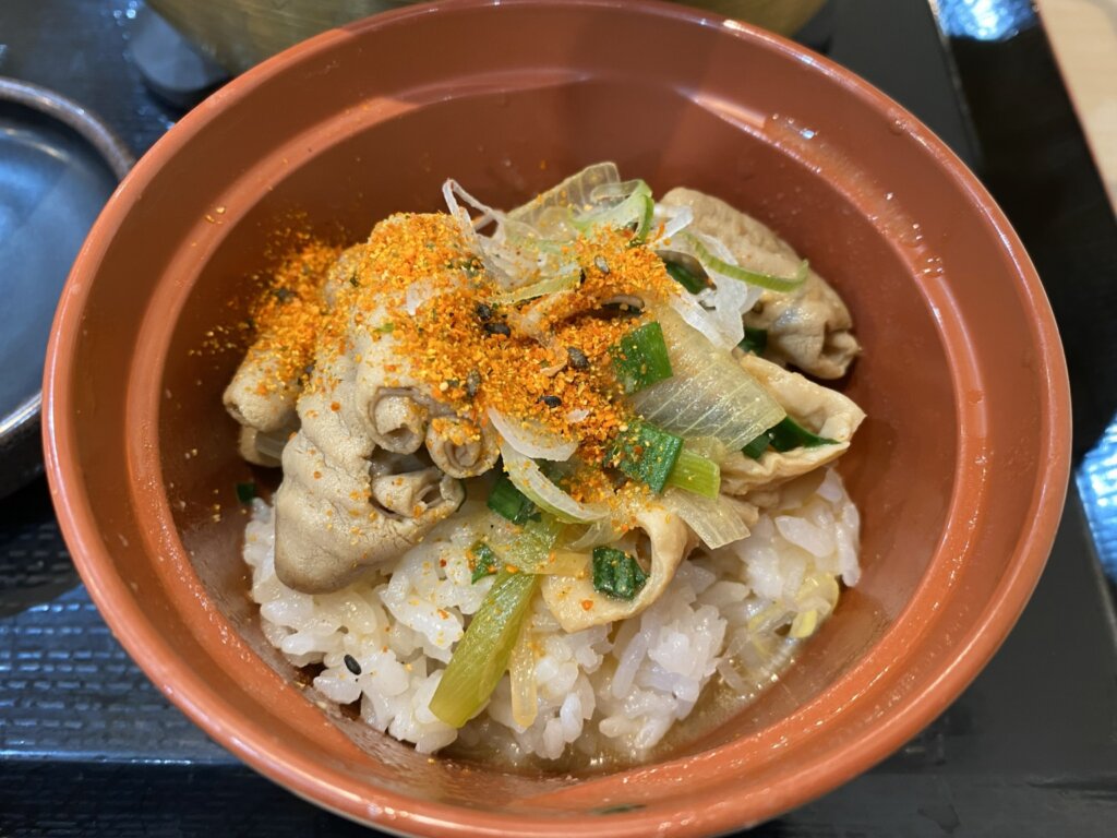 セットのごはんは小盛というわりにはけっこうな量でして、3分の1をそのまま食べてから、次の3分の1はモツやこんにゃくをのせてスープをかけていただきました。