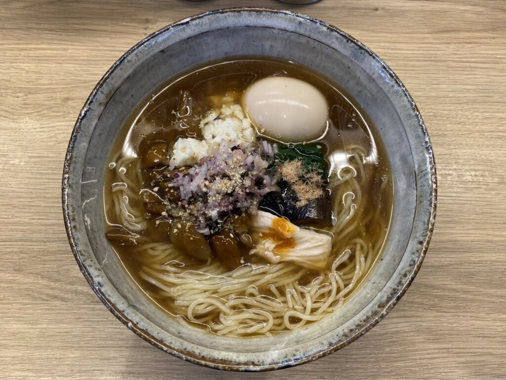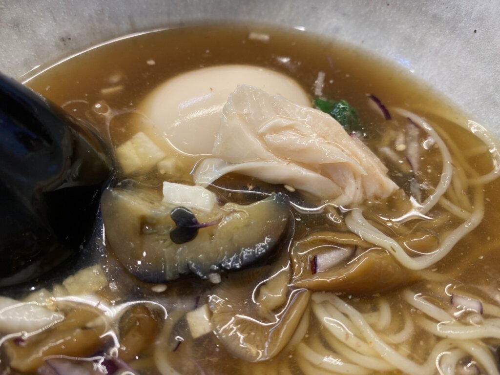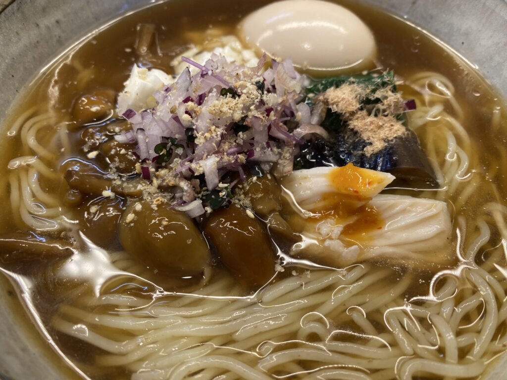 ほのかな茗荷の風味もいい感じだし、茄子の煮物やソース状の柚子胡椒をのせた鶏肉、そして味玉もつけたので、おかずもたっぷりで満足度が高いです!(^^)!