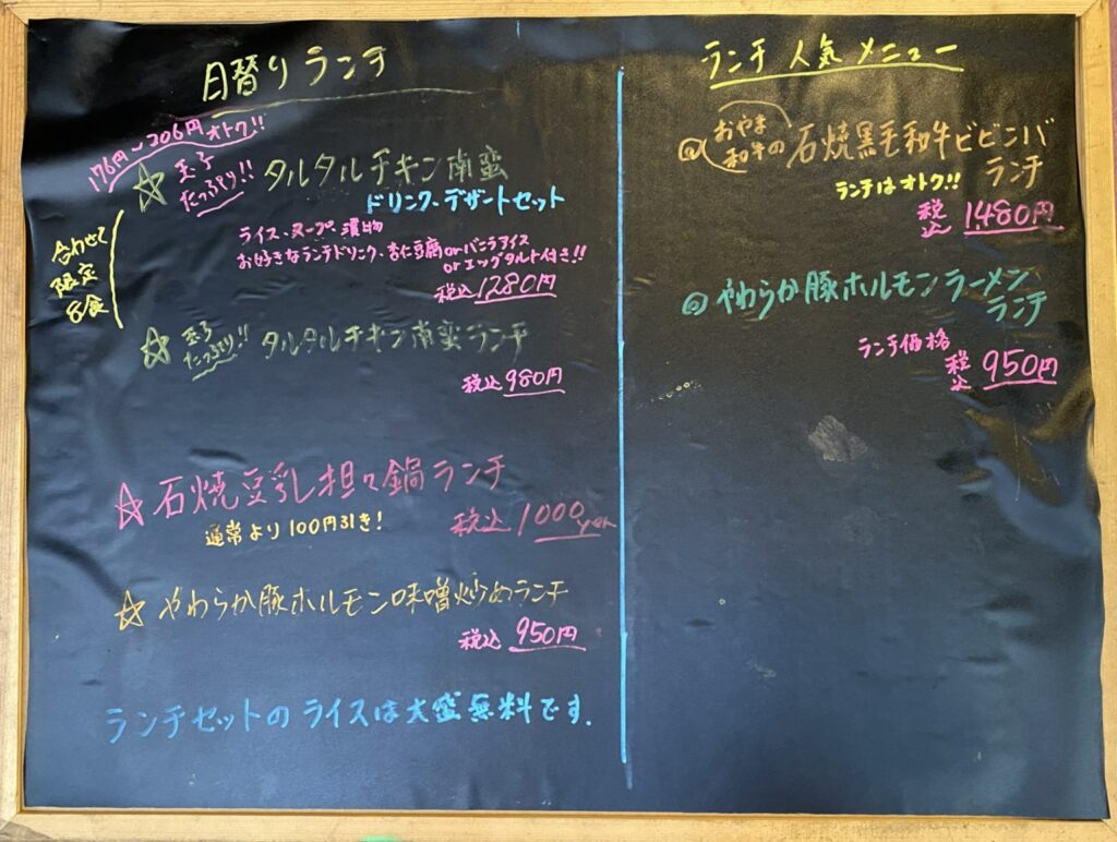 メニューは中華料理と石焼ビビンバという、ちょっと変わった組み合わせのお店です。メニューがいろいろあって迷っちゃうので、黒板から選びましょう♪