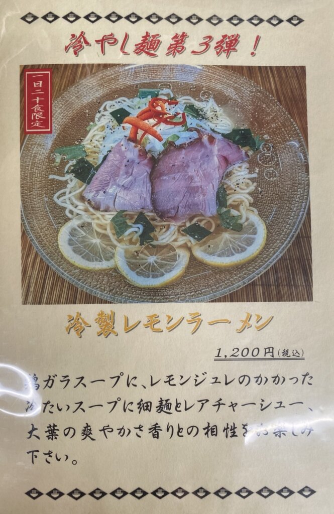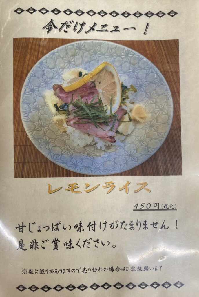このレモンラーメンはかなり評判が良いらしく、早くも再登場を望む声が多数寄せられているとのこと。食べたらそれも納得でしたが、残念ながら大将の限定は二度と同じものは登場しないんですよね(^-^; 実際に、大将いわく、来年はレモンのつけ麺を考えているそうですよ。
