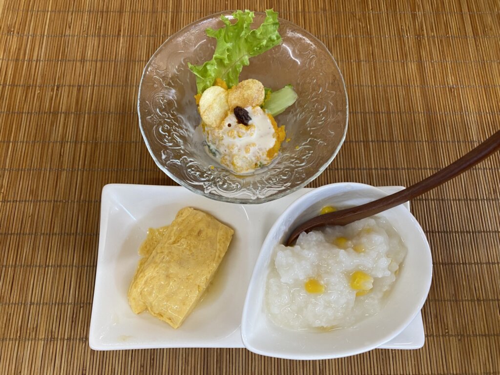 今回のメニューは「かぼちゃとじゃがいものサラダ・白酢ドレッシング」「玉蜀黍の冷し粥」、そしていつもの「皆大好きな大将の出汁巻き玉子」です。