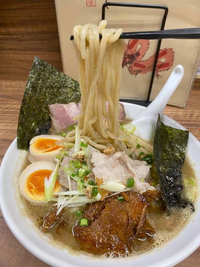 煮干しがほどよくきいたネロっとしたスープに、ツルもちの太麺。今日も美味いですね~(^^♪