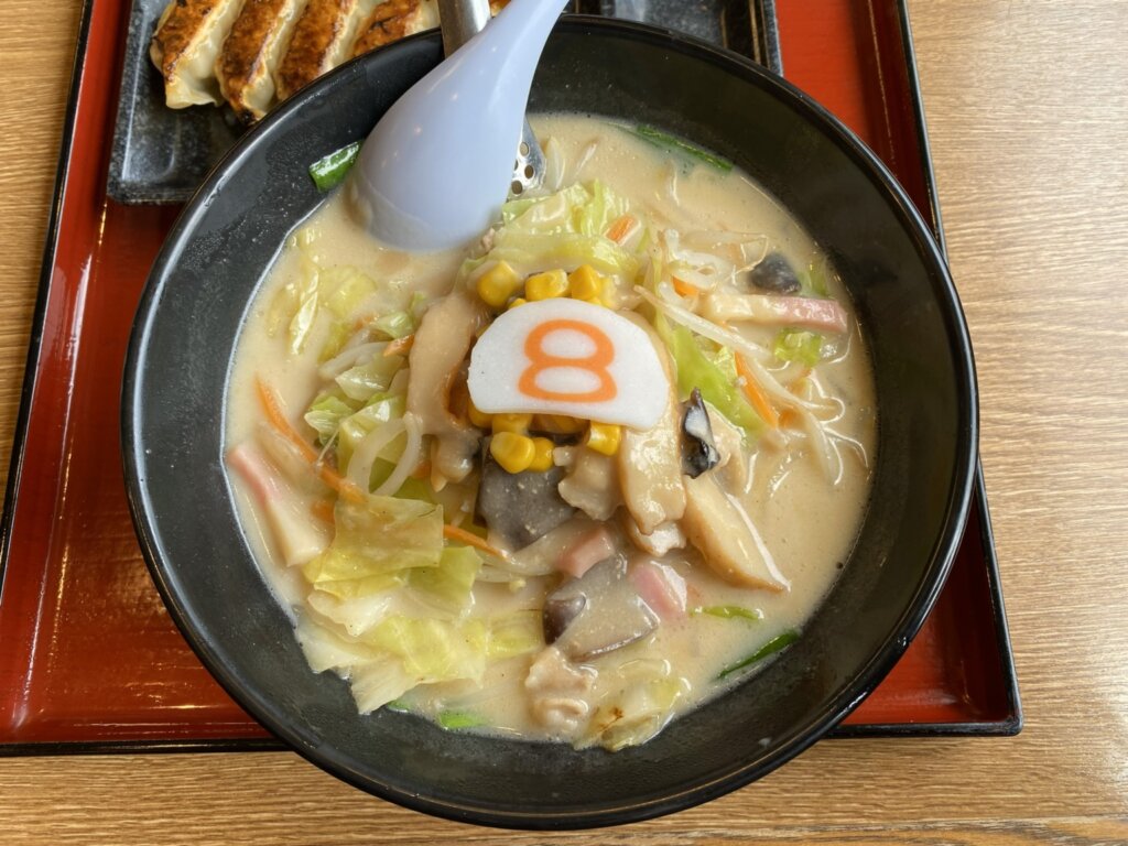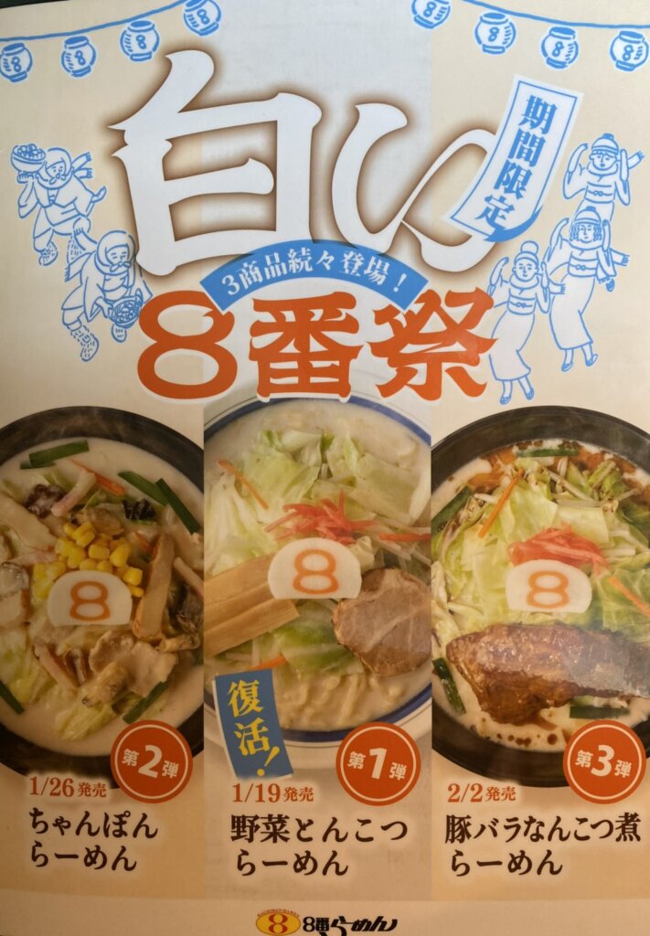 現在の8番は、「野菜牛もつ煮らーめん」「牛もつ煮唐麺」も終了間近とは言えまだ提供中だし、白い8番祭りも2種類(もうすぐ3種類目も登場)と、期間限定メニューのラインナップが超豪華な状態です。