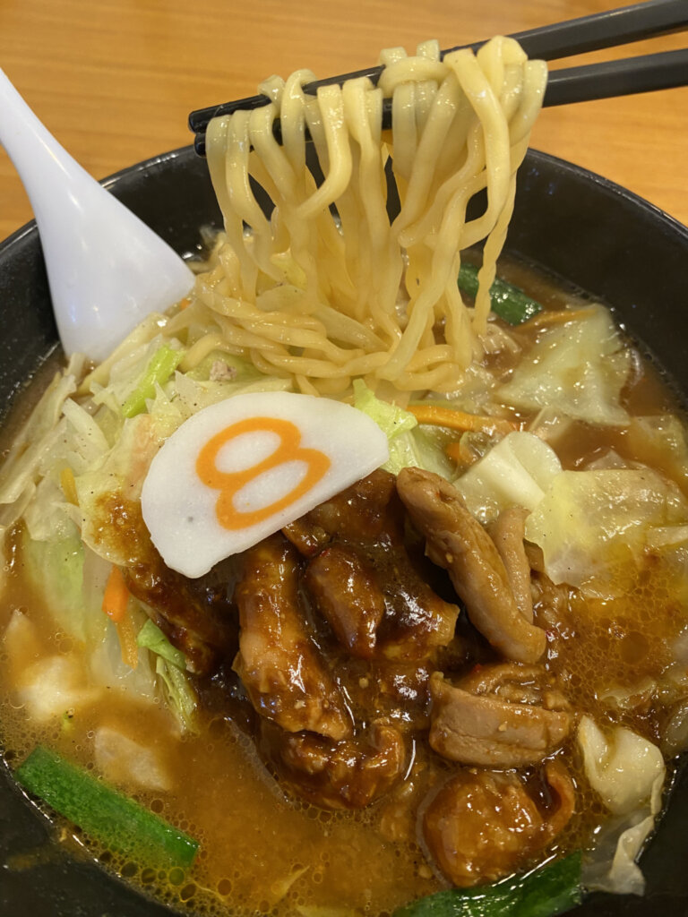 ベースは味噌味の野菜らーめんだと思うのですが、牛もつのタレに唐辛子が入っているので、ラー油を入れなくてもスープがいい感じの辛さになって、コクも格段に上がります。