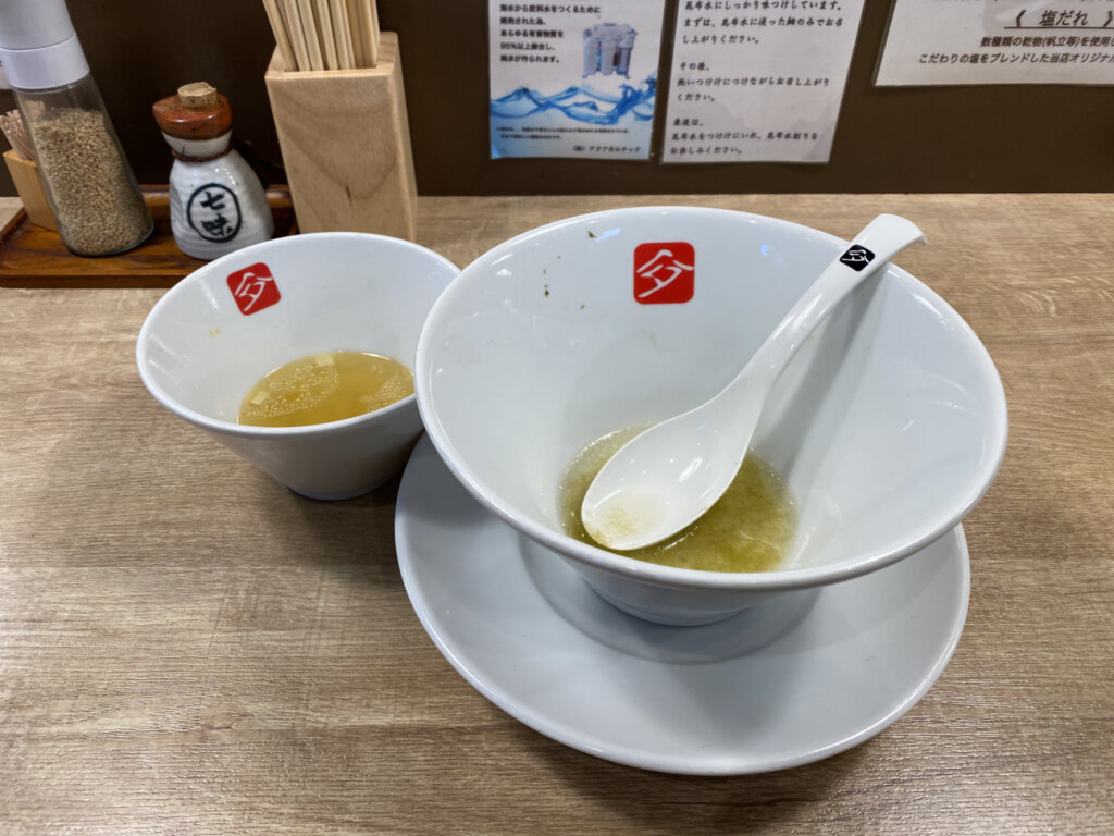 完食してもまだ終わりではありません。つけ汁はそれなりに塩分濃度がしっかりしていたので、今回は昆布水につけ汁を数杯入れて楽しみました(^^♪